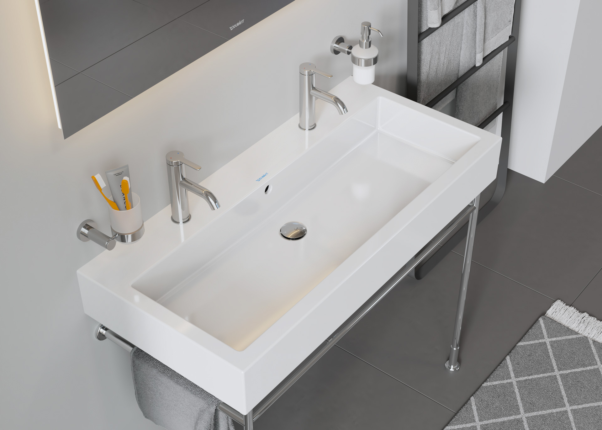 Sencillamente elegante: el lavabo Vero de Duravit con sifón de diseño y consola cromada es ajustable en altura y tiene un riel alrededor que también sirve como toallero.